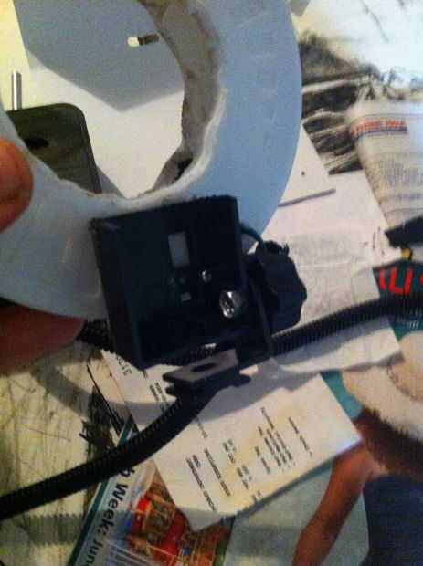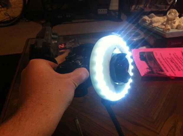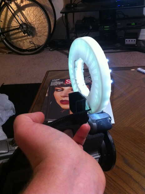 Ahora para una luz de anillo. simplemente tome una medida de tu lente que usted elegiría para caber su luz. y crear un agujero de la matriz, aunque parezca janky. se adapta cómodamente y no tambalearse alrededor.
