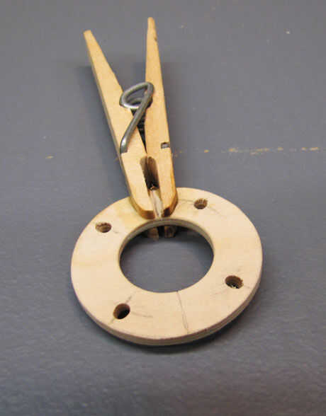 Ranura a un pin de ropa de aceptar su anillo de montaje como se muestra en las fotos.  Use un pegamento apropiado para los materiales que se han seleccionado.  Después el pegamento, cortar el anillo por la mitad.  Compruebe la adecuada acción de sujeción antes de cablear hasta el LED permanentemente.  Conectar los LEDs y la verruga de la pared. (¿Ver su circuito antes de mano ¿verdad?)  Ahora que terminaste - disfruta!