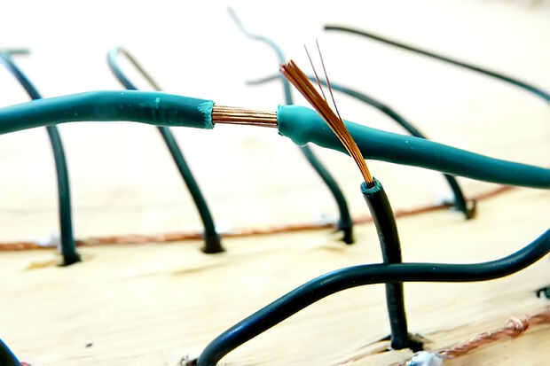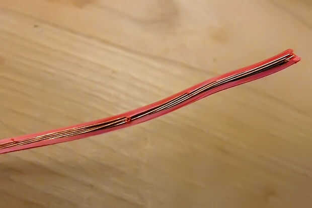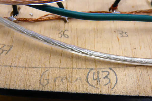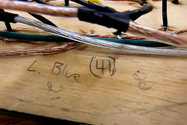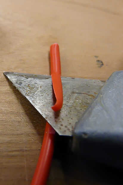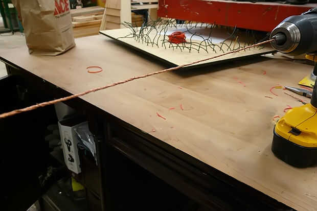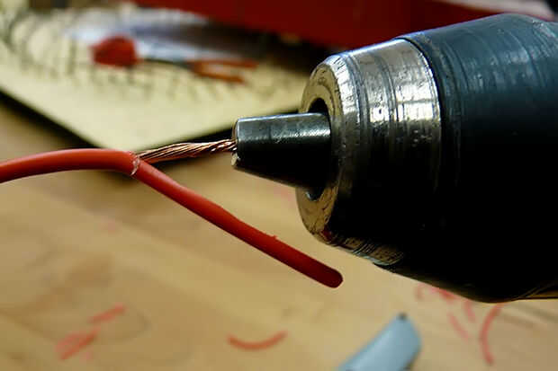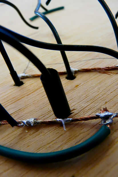 Una vez que todos los LEDs están etiquetados y que esté listo para conectar, empezar por conectar los ánodos junto con una tira de alambre expuesto. No tenía ningún alambre expuesto en mano, así que lo hice yo. Primero, corté el trozo de cable que necesitaba, luego utiliza una cuchilla de afeitar y con cuidado retirar el plástico aislante. El problema era esto me dejó con el cable desenrollado, y era un lío para trabajar con. Para resolver este problema, puso un extremo del alambre en el taladro cuidadosamente mantenga el lado opuesto y utilice el taladro para retorcer el cable hasta que es agradable y apretado.