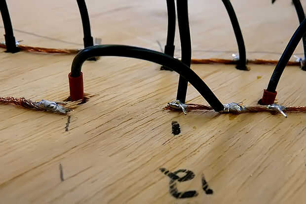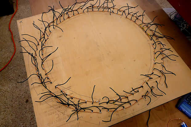 Después de tener listo el cable, es hora de empezar a soldar los pines al cable. Lo hice doblando el anillo exterior de LEDs para el exterior del reloj, con el alambre cubrió debajo de ellos y lo contrario para el aro interior del reloj. Cuidadosamente cada pin del LED cátodo a los cables expuestos, moviéndose todo el día hasta que el ánodo de cada LED se suelda en la posición correcta de la soldadura.