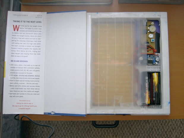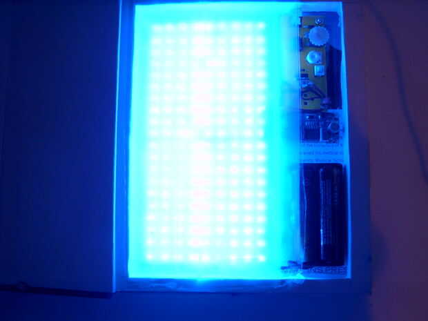 Uso a través de componentes del agujero de la matriz de LED: La matriz de LED con SMD LED de soldadura no fue un paso muy fácil y requiere el uso de grabador para desarrollarlo. Fue un paso de 4 o 5 horas de duración. Si usas LEDs de 5mm, buscar ángulos de haz ancho de alrededor de 130 grados y utilice en su lugar una Junta de perf. Puede que necesite un libro más grueso para una iluminación más uniforme.