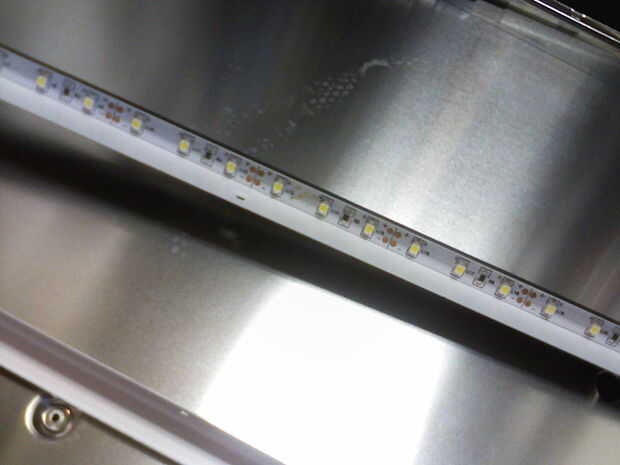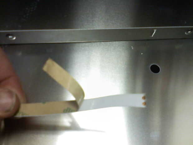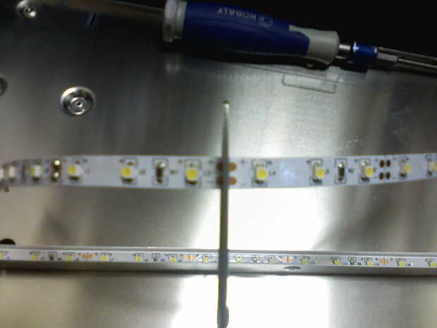 Ahora que quitaron el CCFLs, podía cortar una tira de LED tanto como sea posible donde todavía cabe en el soporte metálico de las CCFLs. Entonces necesitaba soldar cables a los terminales positivos y negativos de la tira LED. Luego, pelar apagado el forro y había pegada la tira de LED en el soporte metálico con los LEDs apuntando hacia la pantalla. Los cables deben salir del mismo lado de la pantalla como los cables originales del CCFLs. Ver la imagen para más detalles.