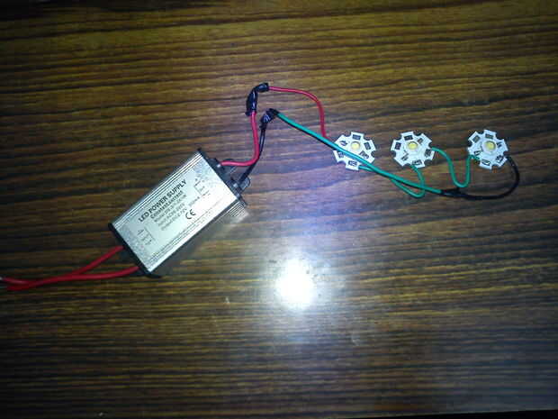 Primero he probado el circuito y soldar todos estos 1W LED de la serie, sólo para tener una idea de la luminosidad podría producir.