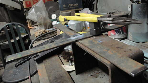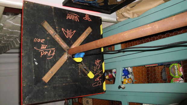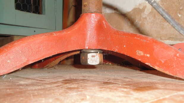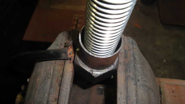 Tuvo que soldar este pequeño trozo de tubo en la barra del tornillo, así encajaría a soldar dentro del tubo de la tabla. Observe el tubo de la mesa ya con la barra del tornillo soldado. La arandela tuerca y bloqueo están sujetando el tubo junto con la mesa de pie. El piso bar Cruz también fue soldado.
