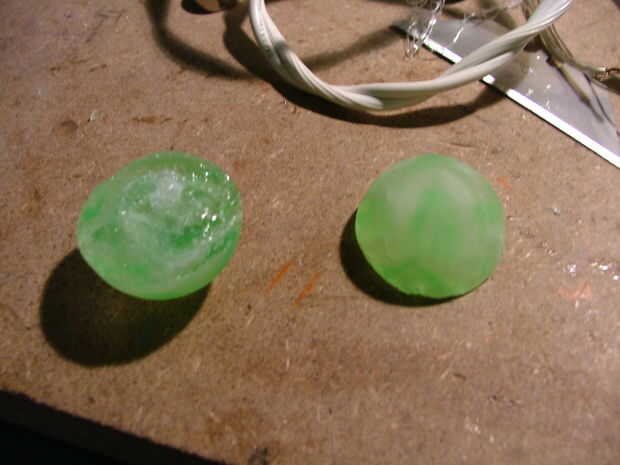 Sugiero usar la hoja de afeitar en este paso ya que hace un solo corte bajando recto más bien que un corte más largo funcionando alrededor de la bola toda (como se haría con un cuchillo del Exacto.) El resultado será dos segmentos totalmente semiesférico de bola super.