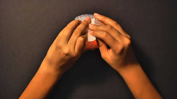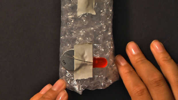 Con el alambre largo hacia arriba, el plazo de ejecución corto desde el LED hasta un extremo del tubo de plástico de burbuja de la cinta. Comenzando en el extremo con el LED, rodar el abrigo de burbuja de la izquierda a la derecha para formar una bola más pequeña. Suavemente apriete la pelota y asegúrese de que el LED se enciende. Si no, ajustar el LED y volver a rodar la bola. La bola cerrada por lo que el LED es apenas apagado de la cinta.