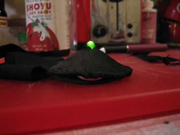 - dos capas de espuma parece un poco grueso. Creo que necesito para hacer sólo una capa de espuma y asegurar el LED y la batería utilizando sólo un pedazo de tela. Esto llevará a cabo de la pieza más pequeña de espuma.