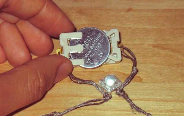 Añadir el soporte de la batería en su configuración. Poner la pila en el portapilas y utilizar el hilo conductor para conectar el soporte de la batería el LED. Cuando el LED está conectado correctamente al soporte de la batería, el LED se encenderá.