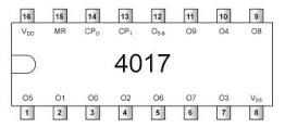 • El contador de década 4017 tiene diez salidas que va alta en secuencia cuando una fuente de pulsos se conecta al reloj de entrada y cuando se aplican niveles lógicos adecuados a las entradas RESET y activar.