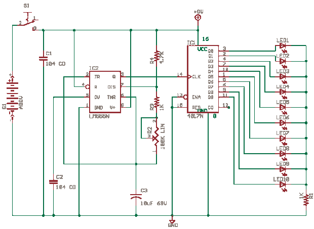 Hay infinidad de circuitos de chaser LED y 1 circuito integrado la mayoría de ellos utilizan para la secuencia (por ejemplo,CD4017) y otra para el reloj (por ejemplo,555). Algunos van más lejos y utilizan un microcontrolador (overkill). Este circuito