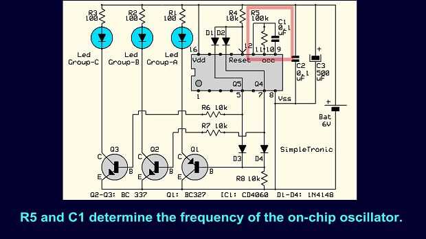 Paso 8: R5 y C1 determinan la frecuencia de reloj (velocidad del chaser)