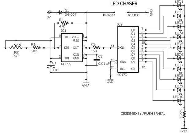 Hay infinidad de circuitos de chaser LED y 1 circuito integrado la mayoría de ellos utilizan para la secuencia (por ejemplo,CD4017) y otra para el reloj (por ejemplo,555). Algunos van más lejos y utilizan un microcontrolador (overkill). Este circuito