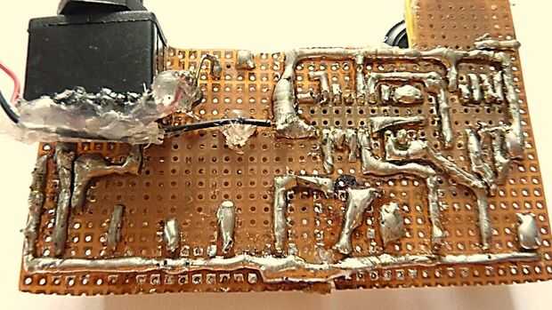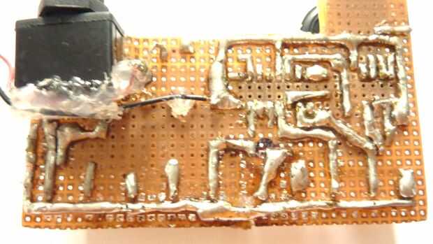 Construir el circuito en un perfboard (usted puede corroer su propio PCB para este proyecto si lo desea). Sólo tener un poco cuidado con los empalmes de la soldadura no deseados y pase un cuchillo de la manía entre ellos después de usted haber soldado todo. Usted puede montar el potenciómetro y encienda el perfboard como yo; pero usted puede ir para un gabinete de electrónica o algo similar. Prueba de la