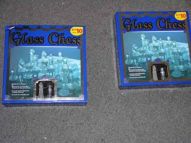 Juego de ajedrez de cristal - yo tengo la mía en Walgreens. Era un dos para la cantidad de $10. He comprado un par por lo que si he roto algunas de las piezas se han extra. Las piezas de ajedrez deben tener una pequeña cavidad en la parte inferior cubierta por unas pegatinas circulares de fieltro, para evitar rayar el tablero de ajedrez de vidrio.