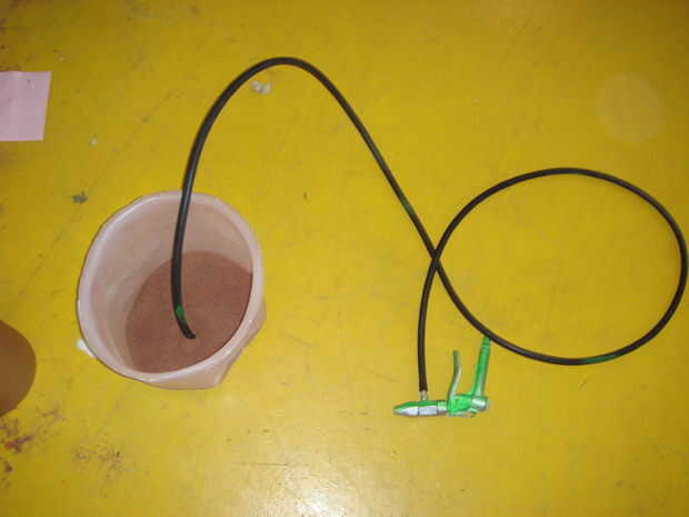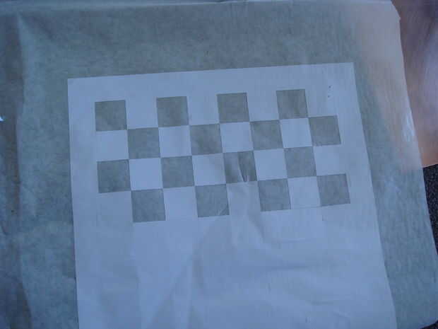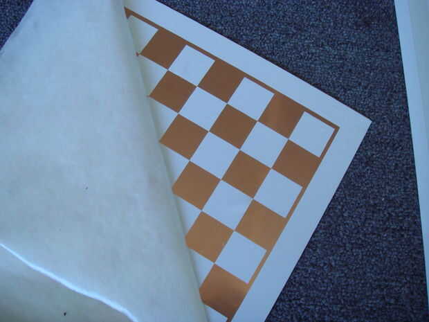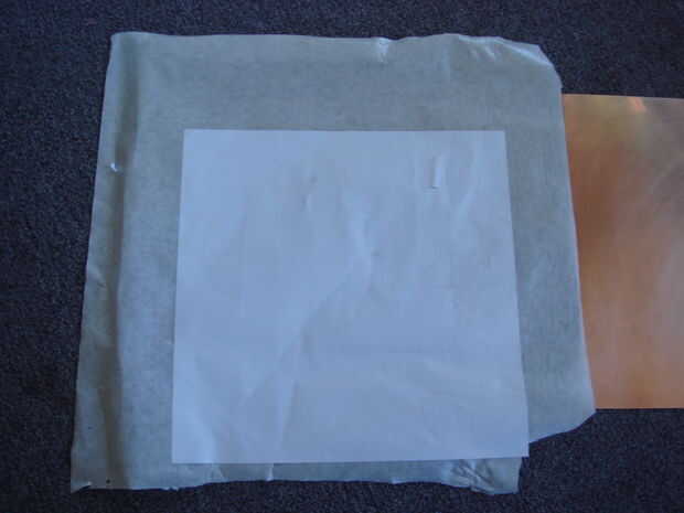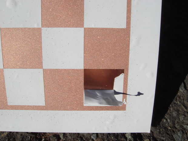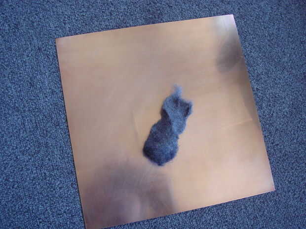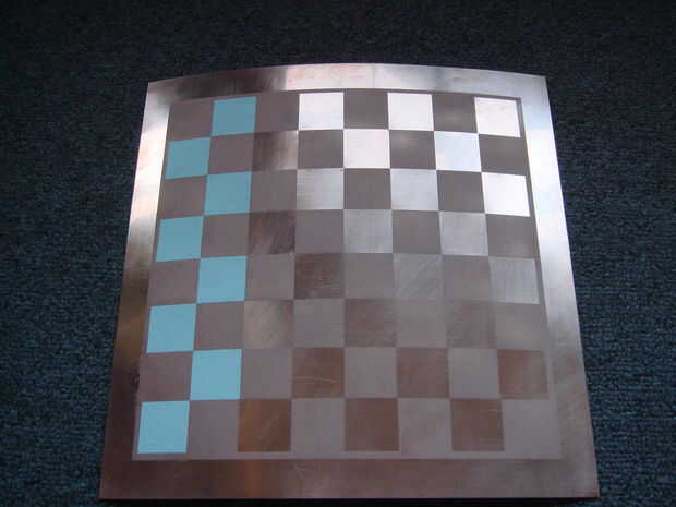 Arenado de un patrón de tablero de ajedrez en la hoja de cobre dará lugar a 32 plazas con el destello cobre brillante original y 32 plazas escarchados que expusieron a los abrasivos. La parte más difícil y más costoso de este paso no se chorreo de arena, pero estableciendo una parada.