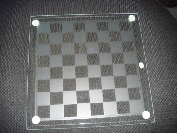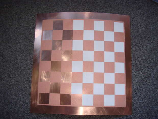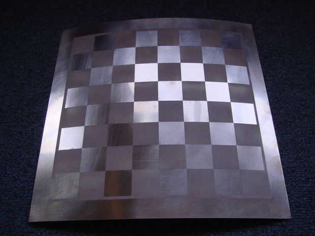 Tuve un pensamiento de momento difícil de la mejor manera de obtener el patrón de tablero de ajedrez en una sola superficie conductora. La placa puede dividirse fácilmente en 64 casillas uniforme, pero que sería terrible. Brevemente considerado utilizando dos metales conductores separados (cobre y acero o similares) y hacer un patrón de tablero de ajedrez por la alternancia de cuadrados de ellos, pero que tomaría demasiado tiempo y esfuerzo. Finalmente decidió que chorreo de arena, la misma técnica usada para hacer el tablero de vidrio original (creo que, aunque puede haber sido grabado químico), sería la mejor manera de bajar el patrón en una superficie metálica conductora.