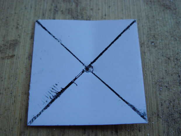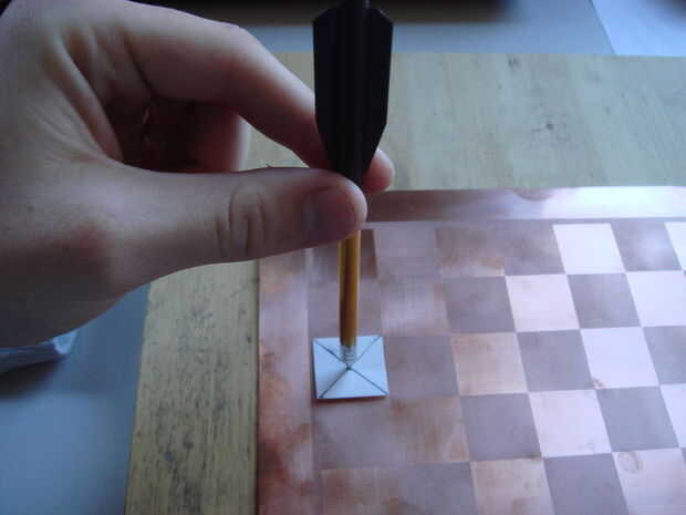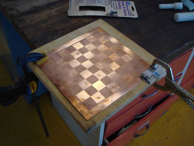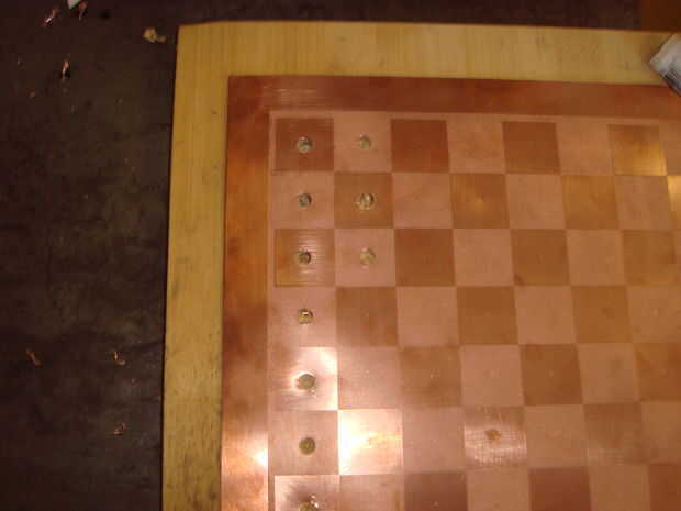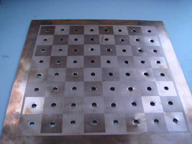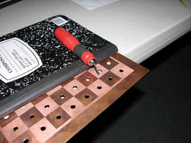 El propósito de este paso es hacer agujeros en la placa de cobre que el negativo (-) los puntos de contacto de las piezas de ajedrez pasar a través de la placa de cobre. Si conoces una manera más efectiva o mejor de conseguir agujeros a través de cobre que lo que describo aquí, no dude de utilizar su propia técnica. Este paso describe el método que utiliza el conocimiento y las herramientas que poseía.
