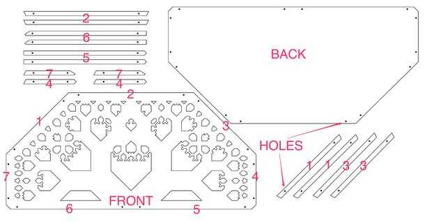 La madera se corta en dos pedazos principales, haciendo la parte delantera y trasera de la cabecera. En lugar de usar juntas para dar la profundidad del cabecero, opté a la CNC un "marco". Eso es lo que todos los bloques de los finos en el archivo de Illustrator. Ha sido marcados con números que coinciden con el borde de la pieza frontal (Nota: el borde inferior se corta en dos placas de apoyo: 5 y 6). Para cada borde, hay dos idénticos de las losas, cada uno una media pulgada de espesor, que apilado uno encima del otro. Esto hace que la profundidad del cabecero = 4 *. 5 "= 2" (frente, espalda y dos capas de losas).