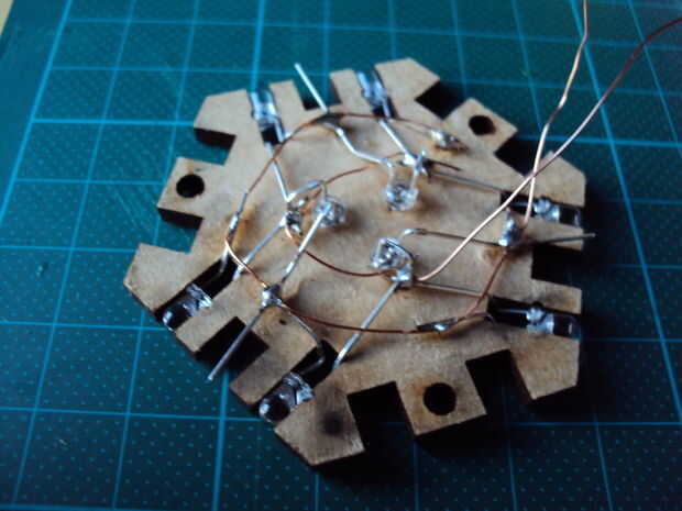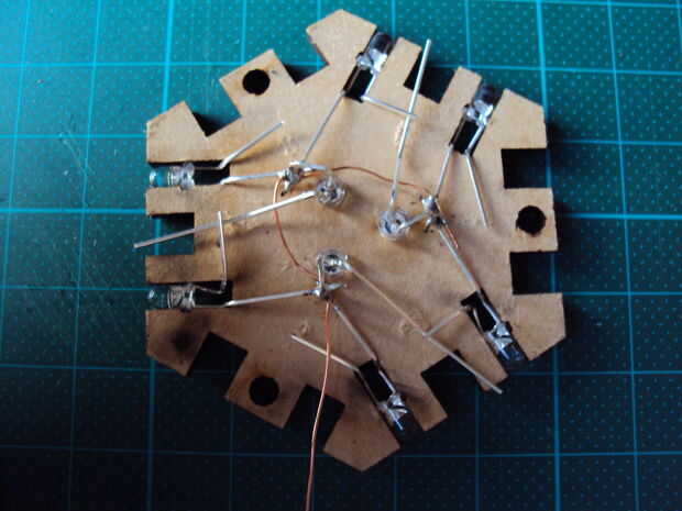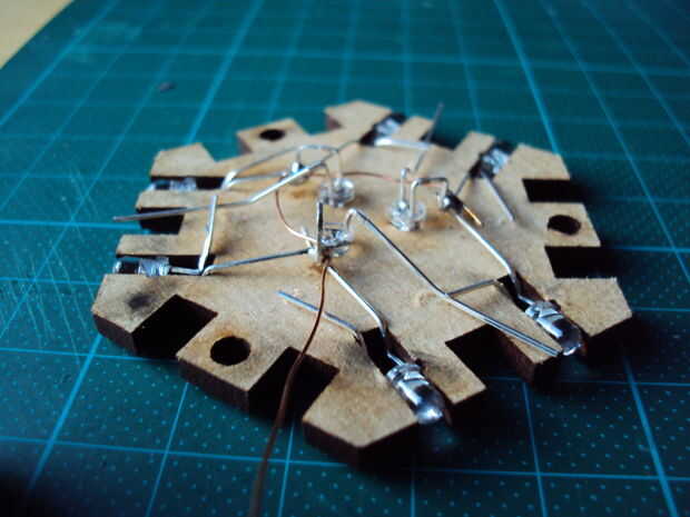 Nu kruisen de los ánodos en het midden. De ánodos van de leds waartussen een lege kant zit worden aan dirección gesoldeerd. Overtollige eindjes Kunnan worden weggeknipt.