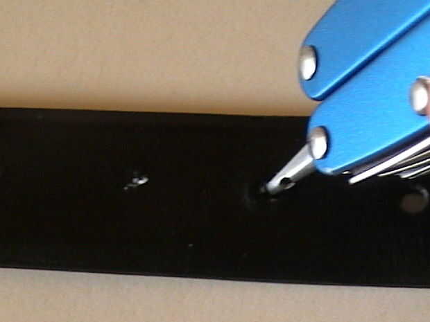 Para el LED ir, es necesario perforar agujeros a través de la correa. Usé la lezna en mi leatherman, pero un martillo y un clavo funciona igual de bien si no mejor. Dependiendo de cuántas luces LED tiene, necesitará espacio en consecuencia los agujeros. Se puede medir, pero la mina por el ojo. Quiere ser por lo menos seis pulgadas de donde termina el cinturón. Si usas tela, vaya al paso tres.