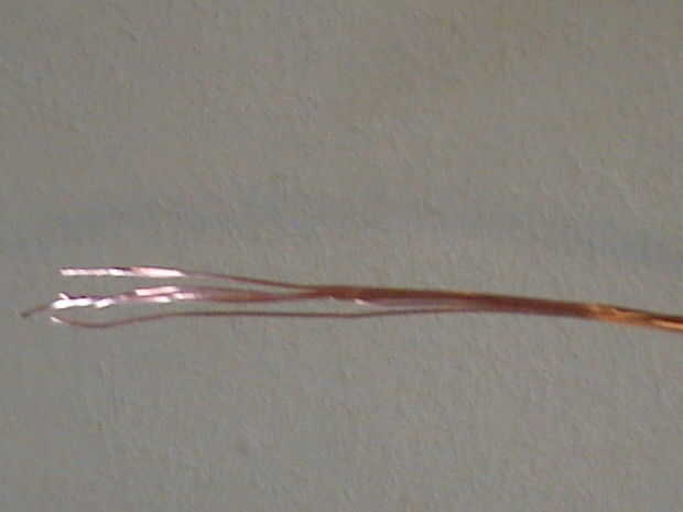 Después han puesto las luces a través de los agujeros, necesitas el cable. Cortar una hebra de hilo que es la longitud de su LED. Aquí le damos la toughy. Necesita pelar el cable completamente de su plasticky (pvc, tal vez?) revestimiento exterior. Esto puede ser un dolor si usted es un idiota (como yo) no tiene un par de peladores de alambre y tienen que usar los dientes. De cualquier manera, usted tendrá que tomar la capa de una pulgada a la vez, ya que es casi imposible despegar la capa a la vez.