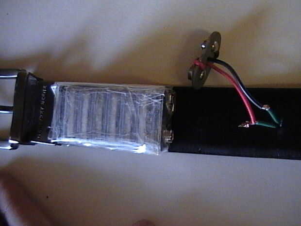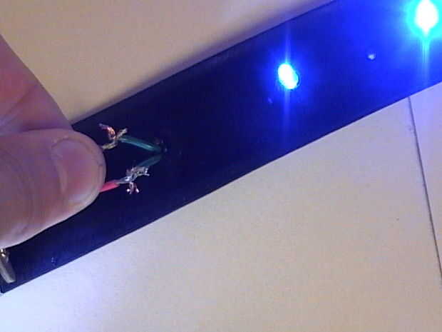Fije el cierre de la batería de nueve voltios y verifique cual cable va con cual lado (positivo o negativo). El cinturón deberá encenderse. Si no, vuelva y asegurarse de que ningún cable se toque. Luego perforar otro agujero en el cinturón, que permitirá a los conductores a pasar por la parte delantera a la parte posterior. Esto debe ser aproximadamente seis pulgadas de la hebilla. Si los cables de batería rápidos son demasiado cortos, extenderlos. Pegar los cables a través de la correa para que el cierre es en la parte frontal y los cables están en la parte posterior. La soldadura de los extremos del caso a la cadena de LED. Cinta de la batería en la parte delantera para que llegue a la presión.