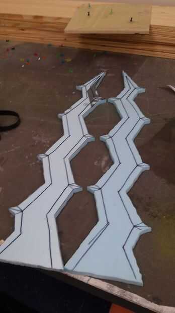 - delinear sus líneas el bisel y la plantilla (copiados de la impresión de la plantilla) en una sola pieza de la espuma, luego coloque las dos mitades y utilice un alambre caliente para obtener el esquema básico. puesto que la otra mitad es una imagen de espejo, asegúrese de invertir sus líneas de contornos y biseles que se prepare la segunda mitad.