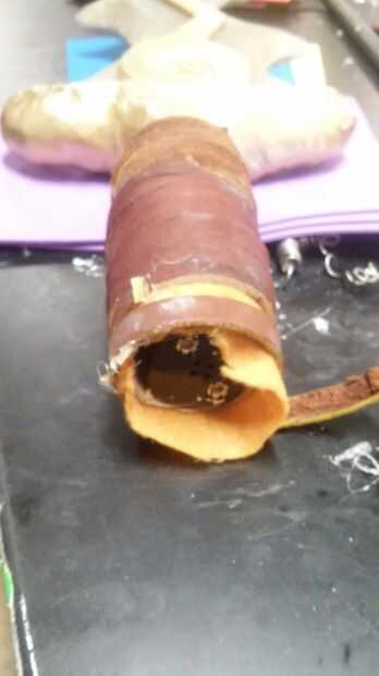 - primero usted necesita hacer el mango real. Enrolle el cable sobrante alrededor de la batería y ponerlo todo en un tubo de papel higiénico (para hacer las baterías reemplazables). cubierta de fieltro marrón para que los espacios entre las tiras de cuero en su mango no serán visibles.