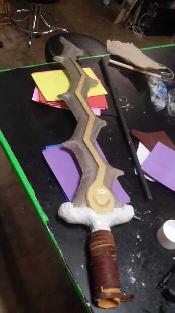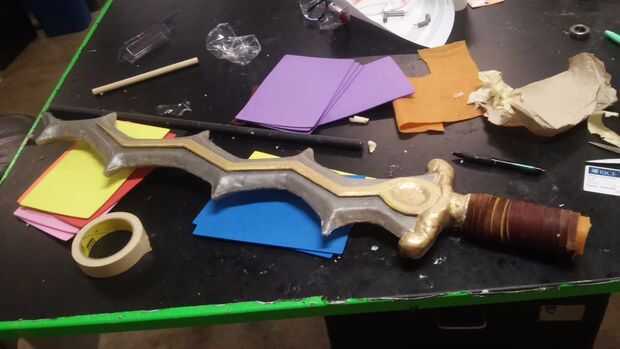 - la empuñadura se llevará unas 2-3 horas para configurar, pero asegúrese de comprobar en él durante ese tiempo especialmente si estás dejando plana y seca para evitar que la arcilla de colocar. después de 3 horas, alisar a su gusto, utilice cinta adhesiva para cubrir el resto de la hoja y el mango y su empuñadura con pintura de aerosol metálica de oro de la pintura.