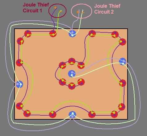 Imagen 2: Éste será probablemente el más útil para usted de cualquiera de los 3 cuadros aquí. De nuevo, los colores no son tan importantes, sólo nota la púrpura es (+) y verde es (-). También, para evitar confusiones el azul LED circuito los cables son un poco más ligeros que los cables de circuitos de LED rojos. Los cables vienen de la Junta para que tenga (+) y (-) los cables para el circuito del ladrón de joule 1 (LED rojo) y ladrón de joule circuito 2 (LED azul). ¿Si te fijas en el paso 2 nuevo puedes ver que los cables morados y verde conectan el (+) y (-) del LED a la derecha? Bien, ya que hiciste dos de esas configuraciones de ladrón de joule con distintos núcleos de ferrita, transistores, etc. que le conectes una configuración (+) y (-) del circuito LED rojo y el otro (+) y (-) del circuito de LED azul como se ve en el diagrama de abajo. Que esto tiene sentido.