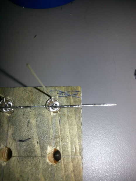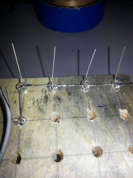 Hacer esto para la fila superior. Entonces desea que las clavijas de tierra va vertical hacia la fila superior soldado tu solo.
