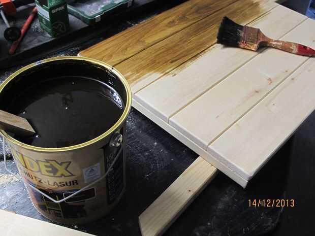 Euer lasiert Holz en der gewünschten Farbe, meine guerra Nussbaum von Bondex (s.o).