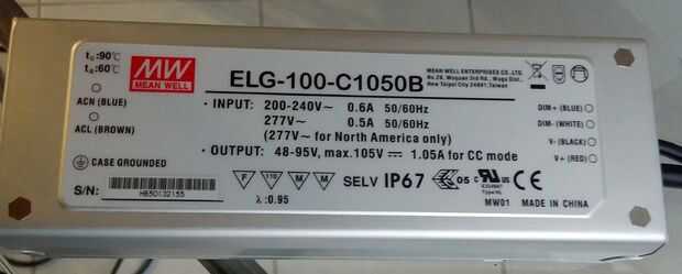 El LED fuente de alimentación controlador modelo es: fuente de alimentación bien significa ELG-100C-1050BLED, 1050mA, 48-95v 99.75w PI67, 3 de CC en la regulación 1.