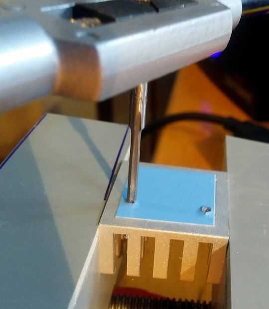 - Medir las posiciones de los orificios en el calor y utilizan algo para marcar antes de perforarlos. (mi "algo" es mostrar al lado del disipador de calor en la primera foto, "incluido" en la sugerencia de traducción en francés, Bienvenido)