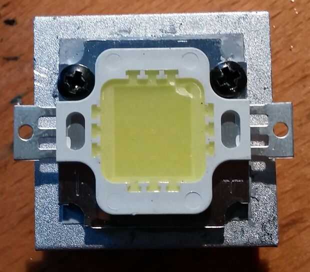 - Instalar el LED y tornillo en la superficie del disipador térmico con dos tornillos de 2x3mm. La base de aluminio del LED es aproximadamente 1,5 señal de mm es muy rígido y transferirá la presión en toda la superficie de la base de LED, asegurando un buen contacto con el disipador de calor.