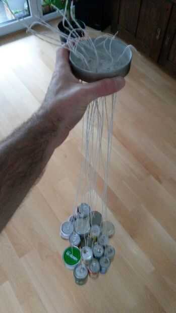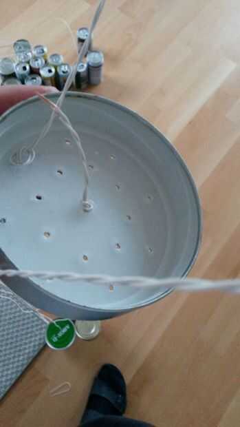 Inserte los cables de sus latas en los agujeros. Hacer un nudo para evitar perder las latas después de haber jodido el encendido a la capota.