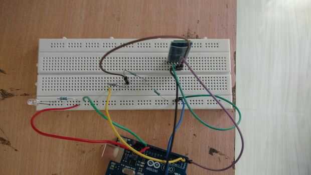 7. Conecte la pata más larga (ánodo del led) al pin 13 y otra pata más corta (cátodo) para uno de los extremos de la resistencia de 1 k ohm y el otro extremo de la resistencia de 1 k a masa de arduino