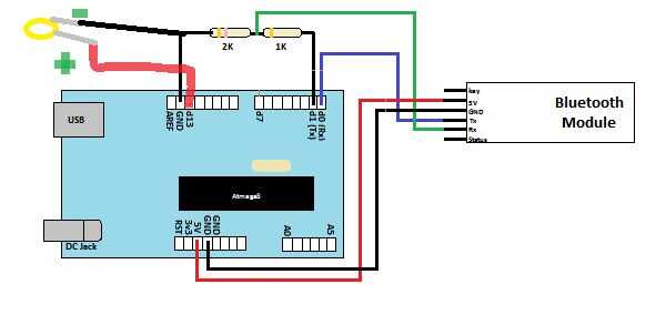 vemos que hay dos resistencias que van desde el pin Rx del módulo bluetooth uno tiene que ser la mitad de valor de la de la otra. Esto es porque el nivel de lógica de Rx es 3,3 v por lo tanto, que tenemos que bajar de 5V de arduino con el circuito divisor de tensión. Si no paso este voltaje entonces podría freírlos hasta el módulo de bluetooth como pin Rx no puede tolerar la 5V. De los simples cálculos podemos ver que voltaje de pasos a 3.3V como