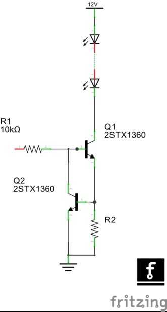Dar una entrada en R1, digamos de un pin de Arduino. Q1 conduce, que significa que hay una corriente que circula del colector al emisor. Si la corriente excede un valor determinado a través de R2, base de Q2 se más positiva y lentamente comienza a "robar" de la base de Q1. Cuanto mayor sea la corriente que se extrae de la carga (en nuestro ejemplo los LEDs), más difícil Q2 empieza a robar la tensión (Vbe) de Q1. Q1 comienza a ser menos conductora, por lo que la corriente a través de nuestros LEDs es limitada.
