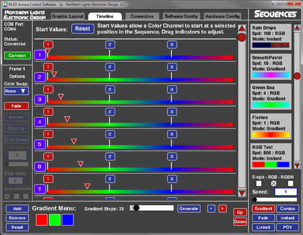 - Las secuencias de editado y creado algunos nuevos. Fue con varias combinaciones de color de espacio de negative(black) y se desvanece lenta encontradas que creó el mejor efecto para este proyecto. Secuencias de gradiente de color trabajadas bien con un valor de paso bajo. Hizo una larga secuencia enlazados, que permite múltiples secuencias de color diferente a encadenado/vincularse, así pueden jugar uno tras otro después de una cantidad seleccionada de iteraciones. Se trata de lo que el dispositivo quedo en normalmente. Prueba, subir y modificar las secuencias de color.