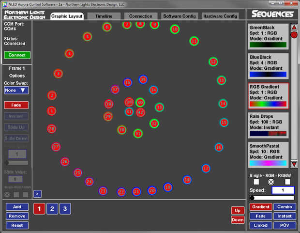 Instalación del software: Para este dispositivo, que los LEDs están dispuestos en 3 grupos, cada grupo tiene una diferente cantidad de LEDs (28 anillo exterior, anillo interior 10, 4 centro). El software permite al usuario utilizar una imagen de su proyecto y colocar los iconos LED en él, para indicar posiciones de LED, esto es muy útil para proyectos como éste cuando la necesidad de LEDs controlada en grupos