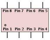 El temporizador 555 tiene 8 terminales, cada uno con una función específica. Los pernos están orientados según el punto indicador en el chip. En la imagen, el punto está situado en la esquina inferior izquierda de la viruta, que representa la ubicación del Pin 1. El resto de los pines siguen en orden de izquierda a derecha en la parte inferior y derecha a izquierda en la parte superior con el Pin 8 está directamente por encima del Pin 1.