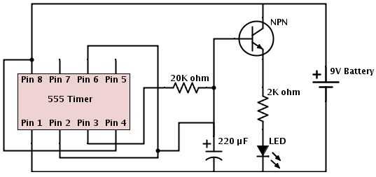 Siga el diagrama de circuito asegurándose de que el temporizador 555 es posicionado correctamente y todos los componentes polarizados se orientan en la posición correcta. El pin 1 está conectado a tierra. Pin 2 es puente con 6 Pin y conectado con el + final del condensador de 220 μF. PIN 3 conectado a la resistencia de 20K Ω y vinculado entre la Base del transistor NPN y el condensador. Pin 4 es puente con Pin 8 y conectado a positivo (+). Colector del transistor de NPN se conecta al positivo (+), mientras que el emisor está conectado a la resistencia de 2K Ω. El LED está conectado al otro extremo de la resistencia de 2K Ω y a tierra. No se utilizan los pines 5 y 7. Compruebe el circuito de los errores y conecte la batería de 9V. El LED debería comenzar a desvanecerse y se descoloran hacia fuera lentamente.