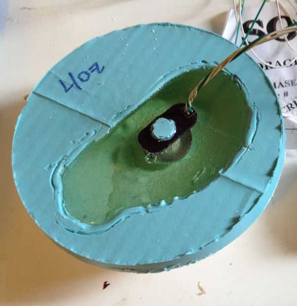 Ahora que se prepara el molde, es momento de mezclar las dos partes de Smooth-Cast 325/6. Esto también es una mezcla de 1:1 volumen. Es una buena idea para obtener una estimación de cuánto material que necesita para que usted no pierda ninguna; Por lo general vierta un poco de agua en adivinar cuántas onzas de líquido necesita y luego seca fuera del molde. (Tenga cuidado que el molde es realmente seco--agua podría estropear su parte del reparto, si hay cualquier resto!) No olvide mezclar bien las dos partes y raspe la Copa a menudo mientras se mezcla. Una vez que las dos piezas son básicamente homogéneas (no distinguen las rayas de color amarillo o claro), Vierta lentamente el líquido en el molde. Tenga cuidado de no salpicar cualquier plástico en sí mismo y tenga cuidado de no sobrellenar el molde. El plástico debe cubrir la tuerca que sujeta el perno, que sin problemas puede interactuar con la pared. Rebote 25 moldes, en este momento, podrían ser necesario ajustar un poco para ser realmente plana--como siempre, tenga cuidado al hacer esto, y no es 100% necesario para hacer tus moldes perfectamente plana.