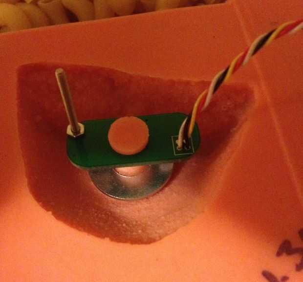 Así! En primer lugar, poner una arandela en el agujero de perno que se pega para arriba en el molde. También poner un tablero allí--probablemente esto requiere comprimir un poco la columna del agujero de perno, pero debe ser un calce para evitar que la Junta se caiga abajo. Asegúrese de que los cables y hace girar el perno son que sale de la bodega. También es una buena idea a la Junta para asegurarse de que es aproximadamente paralelo a la mesa, y para asegurarse de que la tuerca despeja la altura de la bodega la globo ocular.