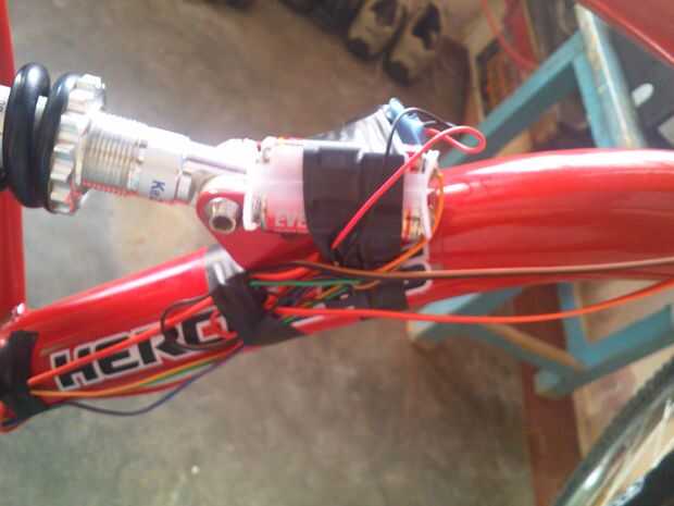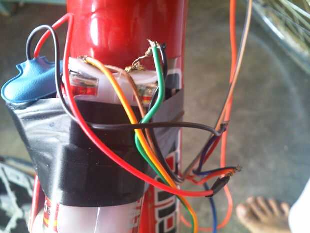 Ahora toma las dos pilas de cuatro voltios y fijarlo en el centro (o encontrar a la derecha lugar que será bueno para ti) de tu bicicleta usando la cinta. Conectar la resistencia de las baterías para evitar que los leds de la destrucción debido a la alta potencia. Tomar los cables conectados a las tiras de metal y conectar a la batería (dos cables de freno delantero para una batería) y dos cables de freno trasero a la otra batería. Ahora se pone en cortocircuito el circuito. Ahora toma los cables del freno led (modificado reflector) y conectarlo a la batería (dos cables para el freno delantero a una batería y dos cables para freno trasero para otra batería). Aunque el circuito se conecta el freno led no brilla por el cortocircuito en las pastillas de última hora, cuando se aplican los frenos que vuelve a iluminar porque se elimina el cortocircuito en el circuito. No te olvides de aislar los cables en el lugar donde se ha unido ya que puede causar más cortocircuitos en el circuito.