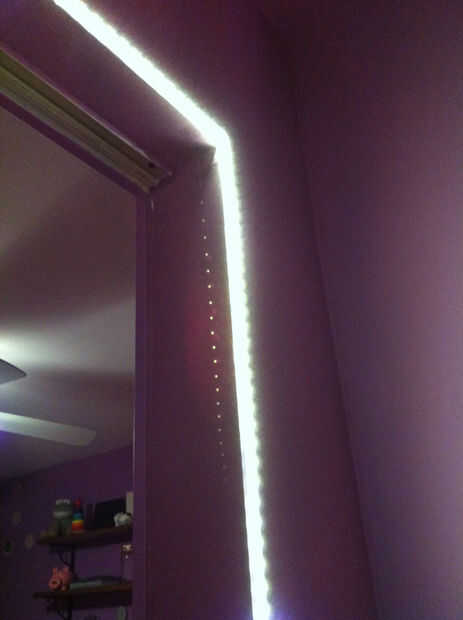 Se les pegó a la pared en el interior de la puerta. Entonces tomé un interruptor de límite de miniatura y había pegado a la pista de la puerta, está conectado con la fuente de alimentación, por lo que el LED sólo cuando la puerta está abierta. Actualmente está conectado a un tomacorriente fuera del armario. Pero estoy pensando que puedo instalar una fuente de alimentación en el armario.