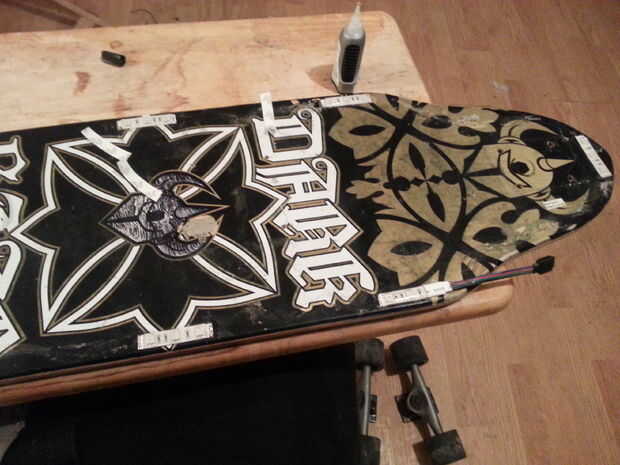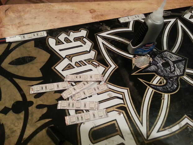 Ahora es el momento para mover todo a la Junta. Pero primero tenemos que exponer las conexiones cobre por debajo de la goma para conectar cada segmento a unos de otros. Simplemente cortarlo cuidadosamente con un cuchillo y quitar la goma. Después de que sea completa, Monte los segmentos alrededor de la Junta, asegúrese de montar a ellos en la misma dirección! Después de todo es montado recomendaría utilizar algún pegamento para garantizar la seguridad!