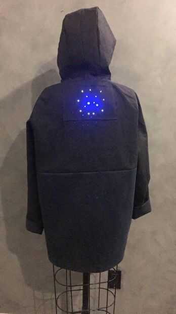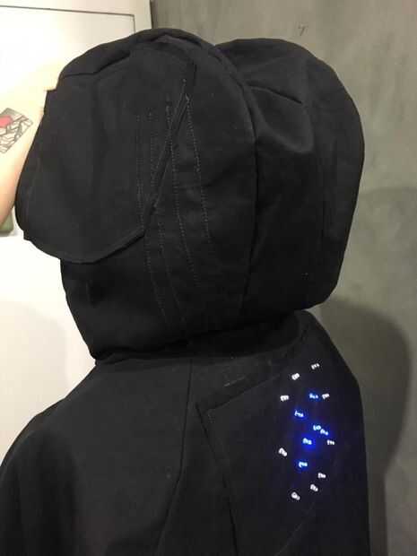 Cuando pones la capota, un triste emoji aparece en la parte posterior con LEDs. Representa cómo personas refugian ellos mismos o no desean ser visto cuando se sienten abajo. La luz es fuerte cuando la persona que usa la campana inclina su cabeza hacia abajo, como si mirando el piso.