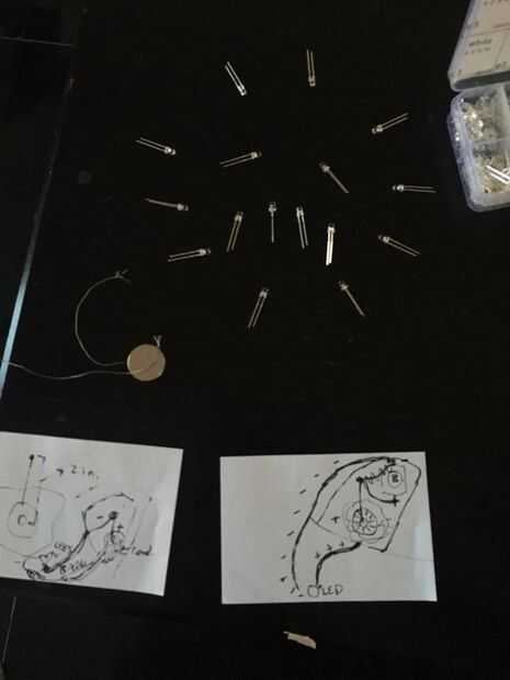 Una vez que usted va alrededor de los LEDs con dos hilos (+ y -), licencia a largo en el borde de los cuadrados tejidos. Estos hilos de rosca largo se tirado dentro de la sudadera con capucha y conectados con los hilos largos que se unen a la batería + tela conductora/arandelas.